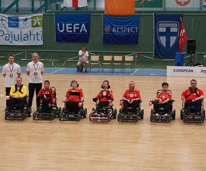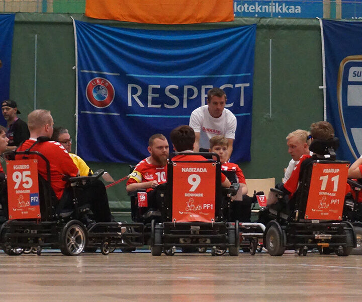 Danish National Power Chair Team. Powerchair football is a sport where people with disabilities play football. It's four against four on a court the size of a basketball court and here it's all about scoring goals - just like in ordinary football.